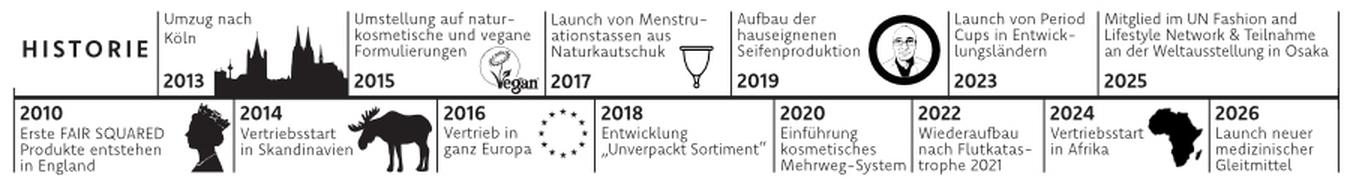 Produkte der ersten Stunde waren Kondome, Handcremes und Lippenpflege. Die Nachfrage wuchs schnell und weitere Vertriebspartner begannen in Skandinavien und Benelux den Vertrieb der FAIR SQUARED Produkte. Im Jahre 2013 zog die Firma nach Köln um, firmierte fortan als FAIR SQUARED GmbH und verlegte ihre Produktion in den deutschen Teil des Naturparks Eifel. Das Sortiment wuchs von 12 auf 150 Artikel an. Dank der kontinuierlichen Nachfrage unserer Kunden konnte die Anzahl an fair gehandelten Inhaltsstoffen vom Olivenöl aus Palästina, Mandelöl aus Pakistan oder Kautschuk aus Sri Lanka heute auf mehr als 15 Partner ausgeweitet werden. Mittlerweile werden FAIR SQUARED Produkte in ganz Europa vertrieben.